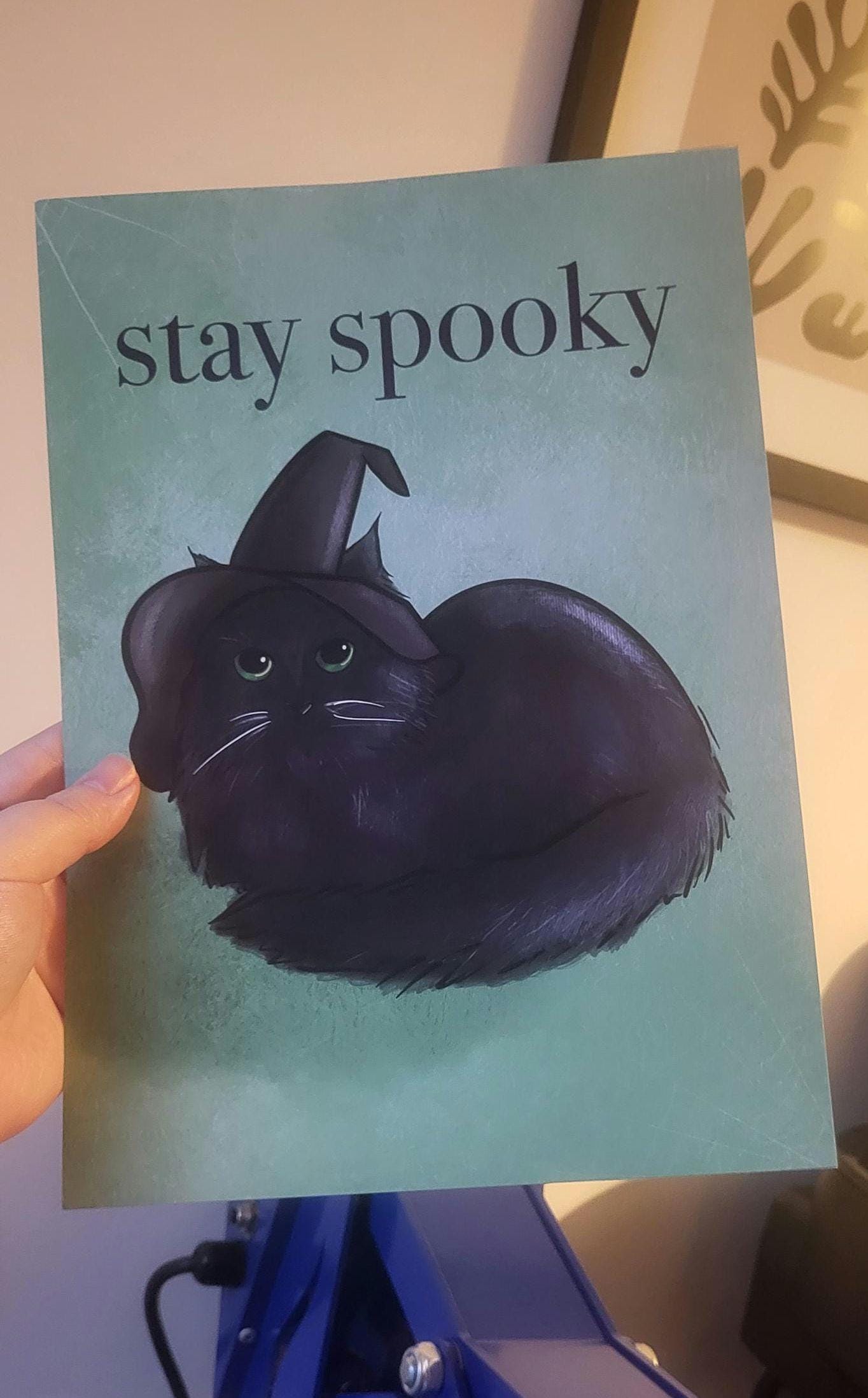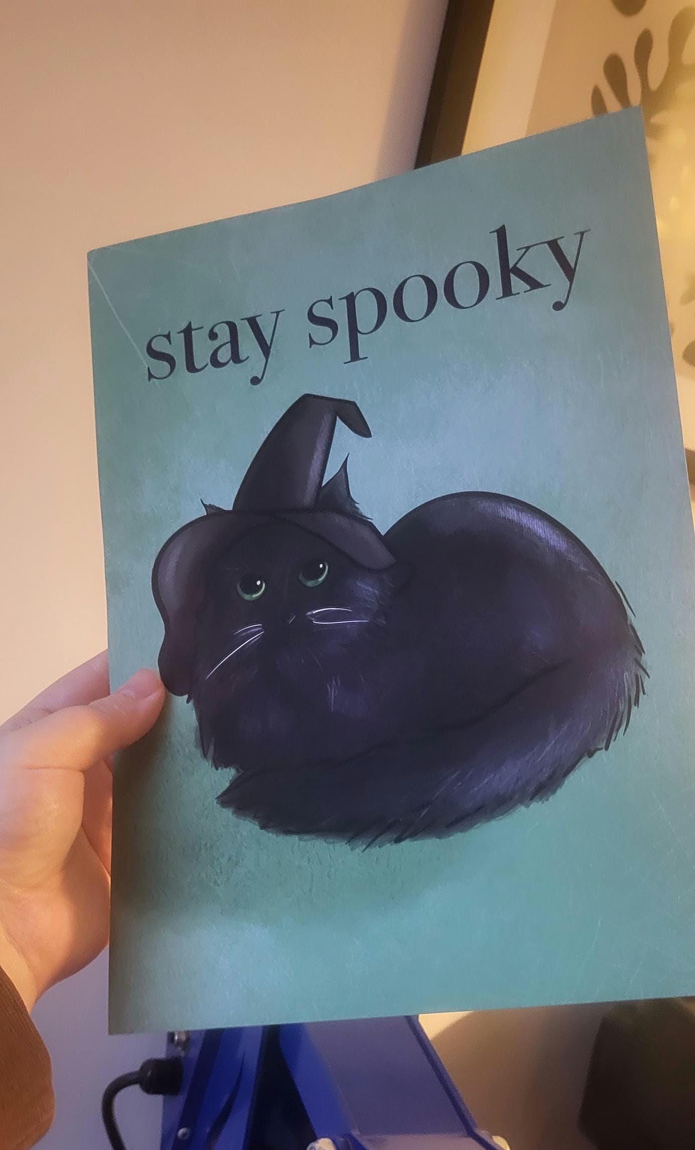 Celebrate your spooky side with this charming "Stay Spooky" Black Cat print, featuring an adorable feline donning a classic witch hat.