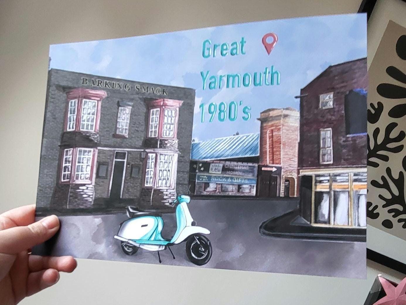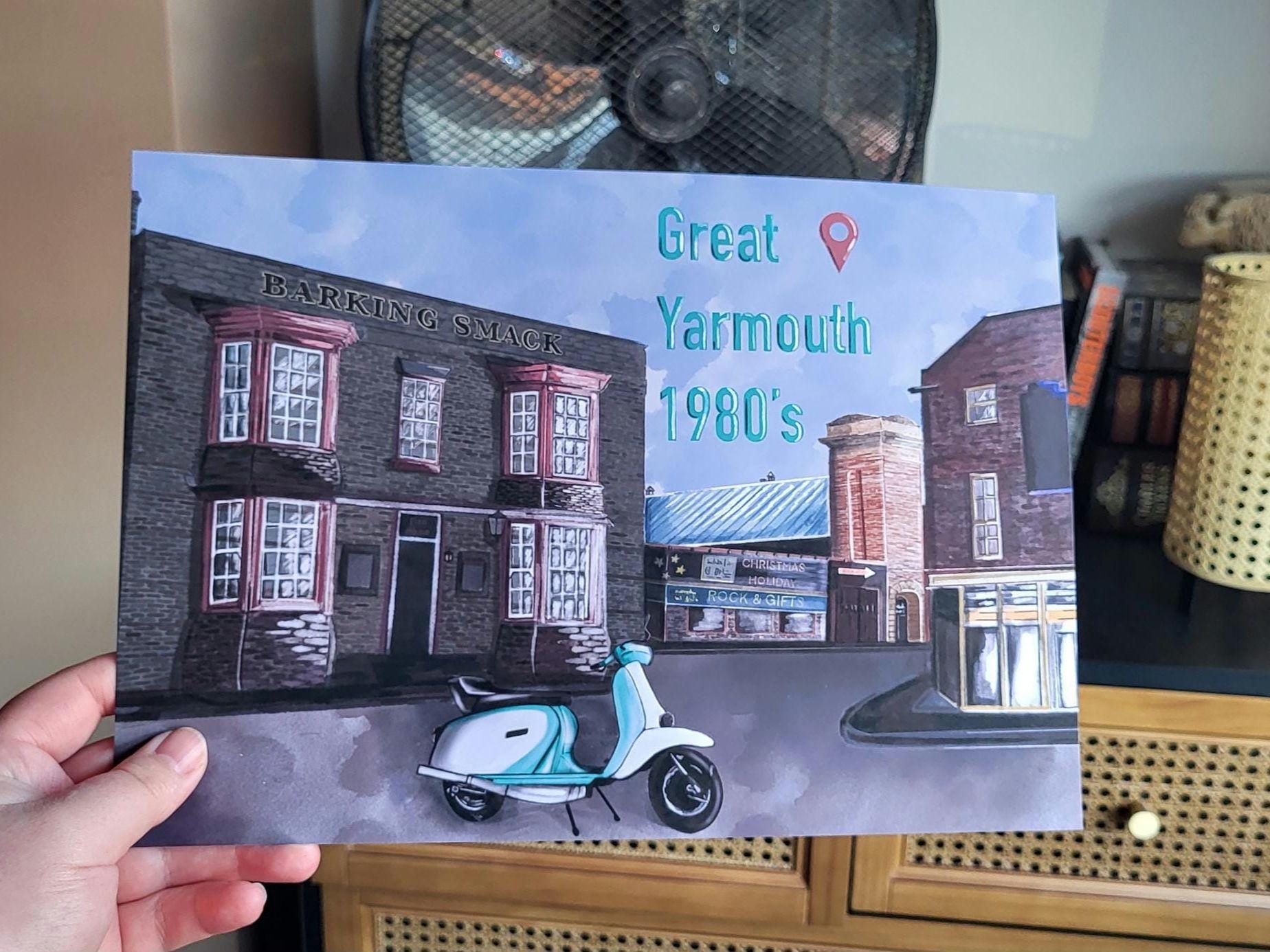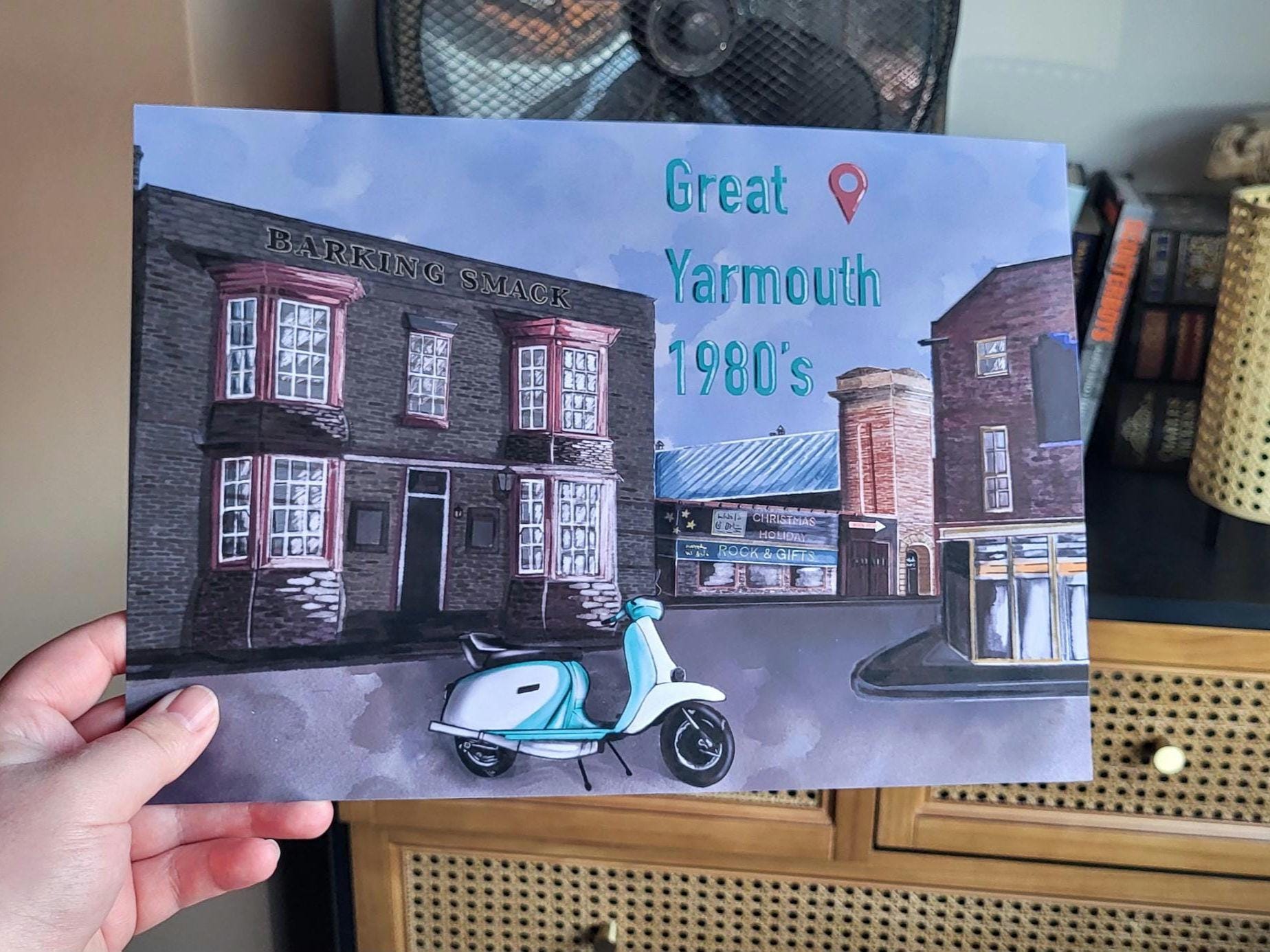 Travel back to Great Yarmouth in the 1980s with this fun print featuring The Barking Smack and a classic Lambretta scooter.