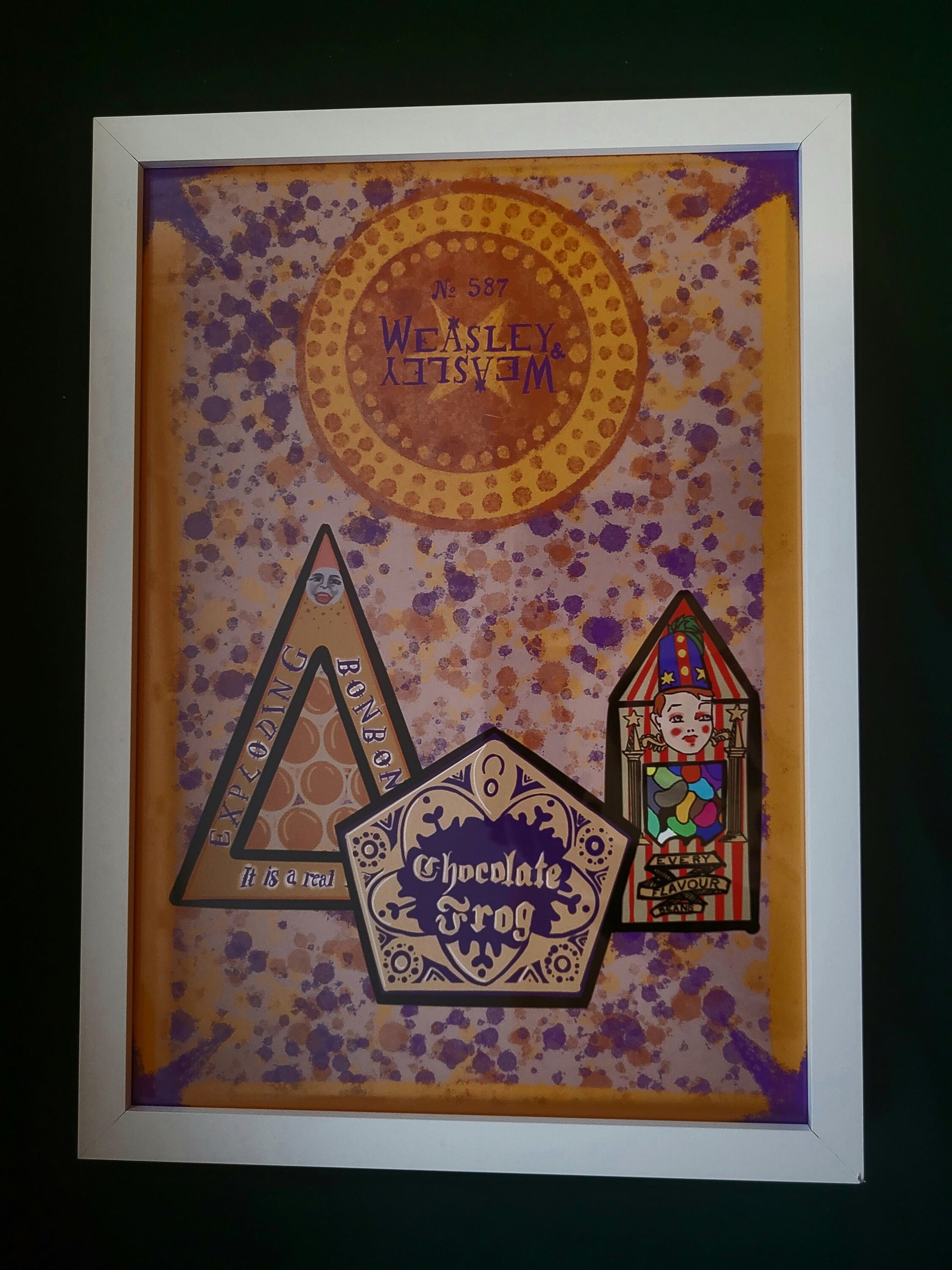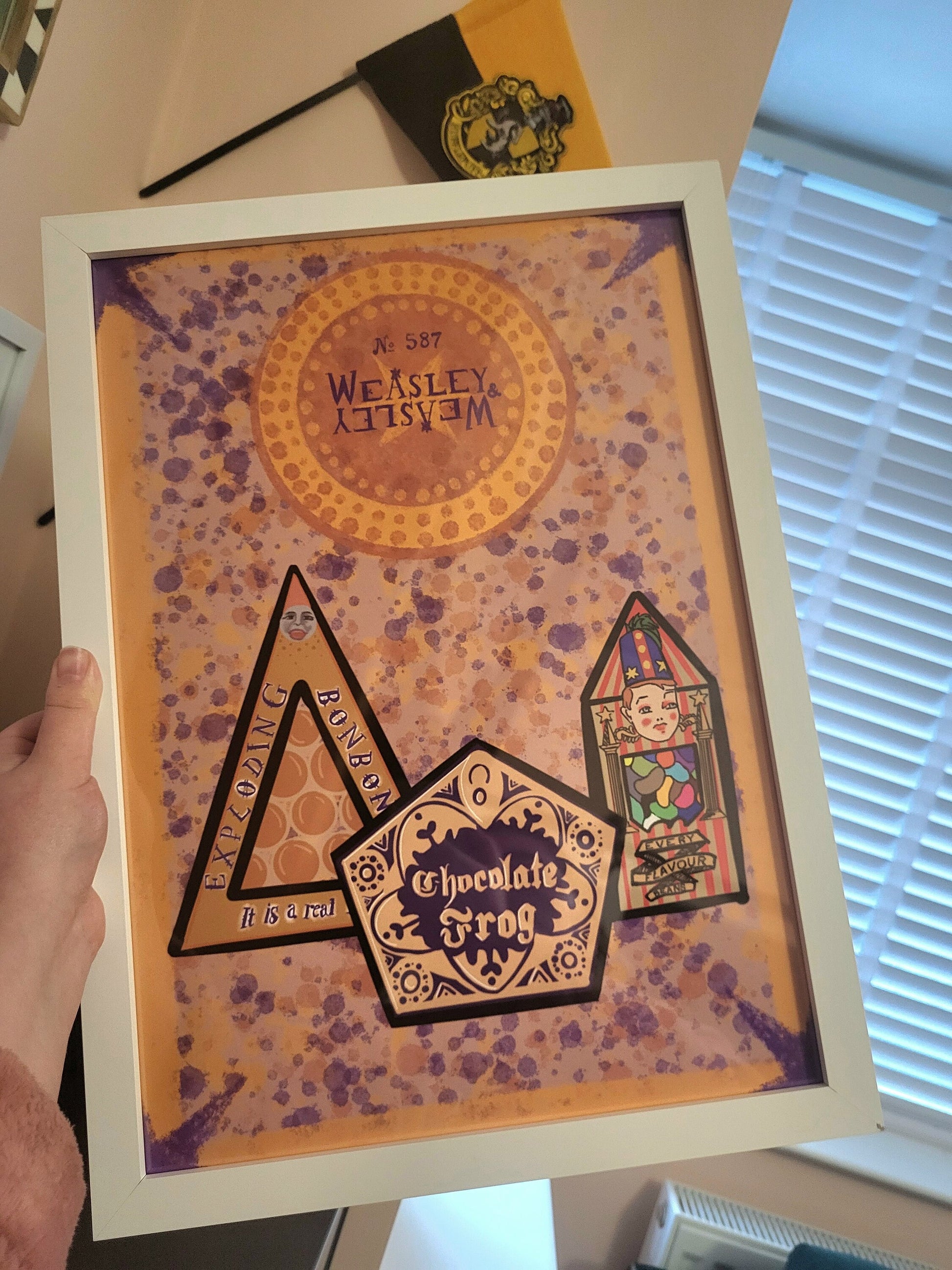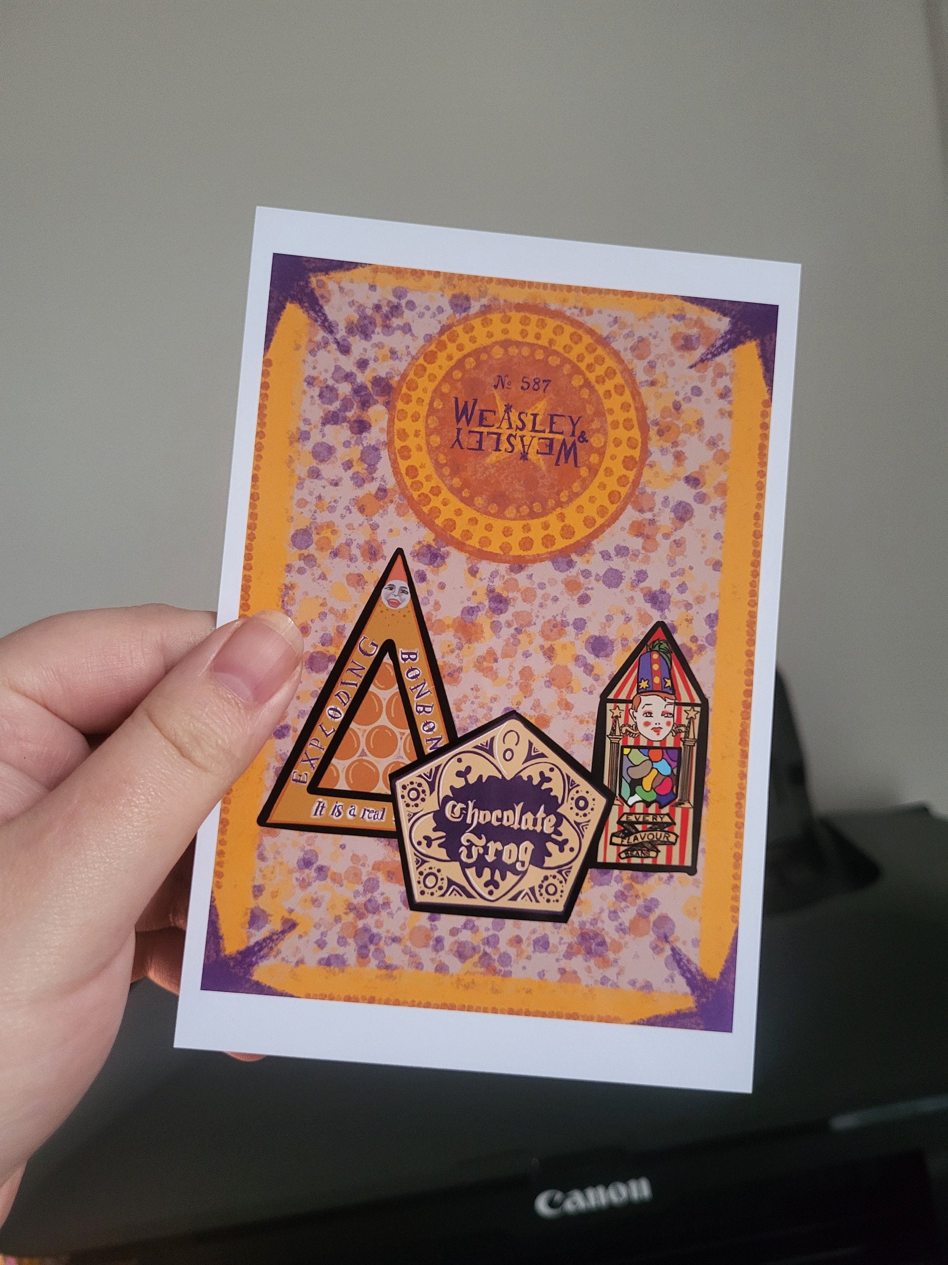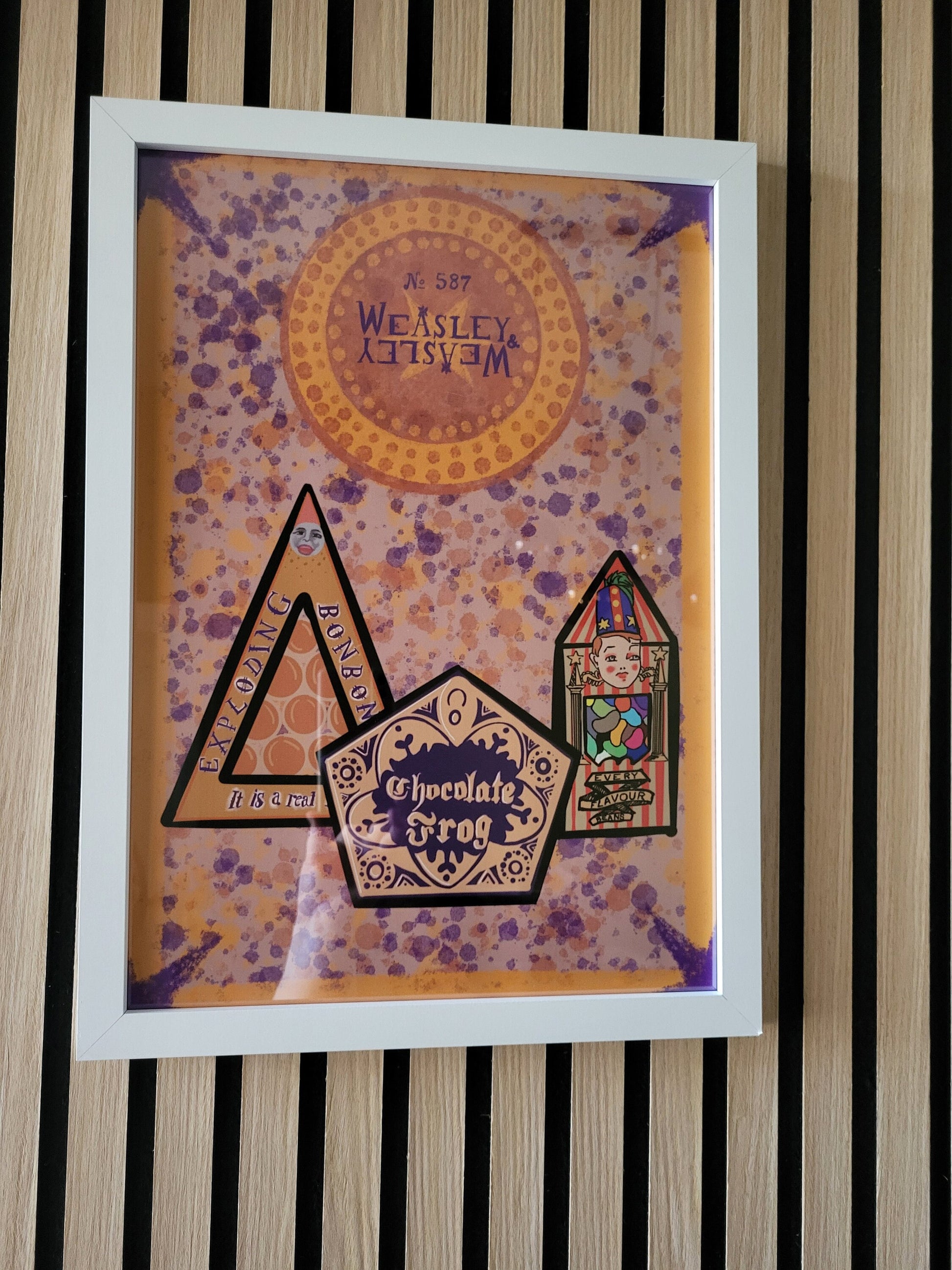 Harry Potter Sweets Print - Weasley and Weasley - Chocolate Frog, Bertie Bott’s Beans, Exploading Bon Bon’s Available in sizes A5 and A4 created by myself inspired by the Harry Potter Films.