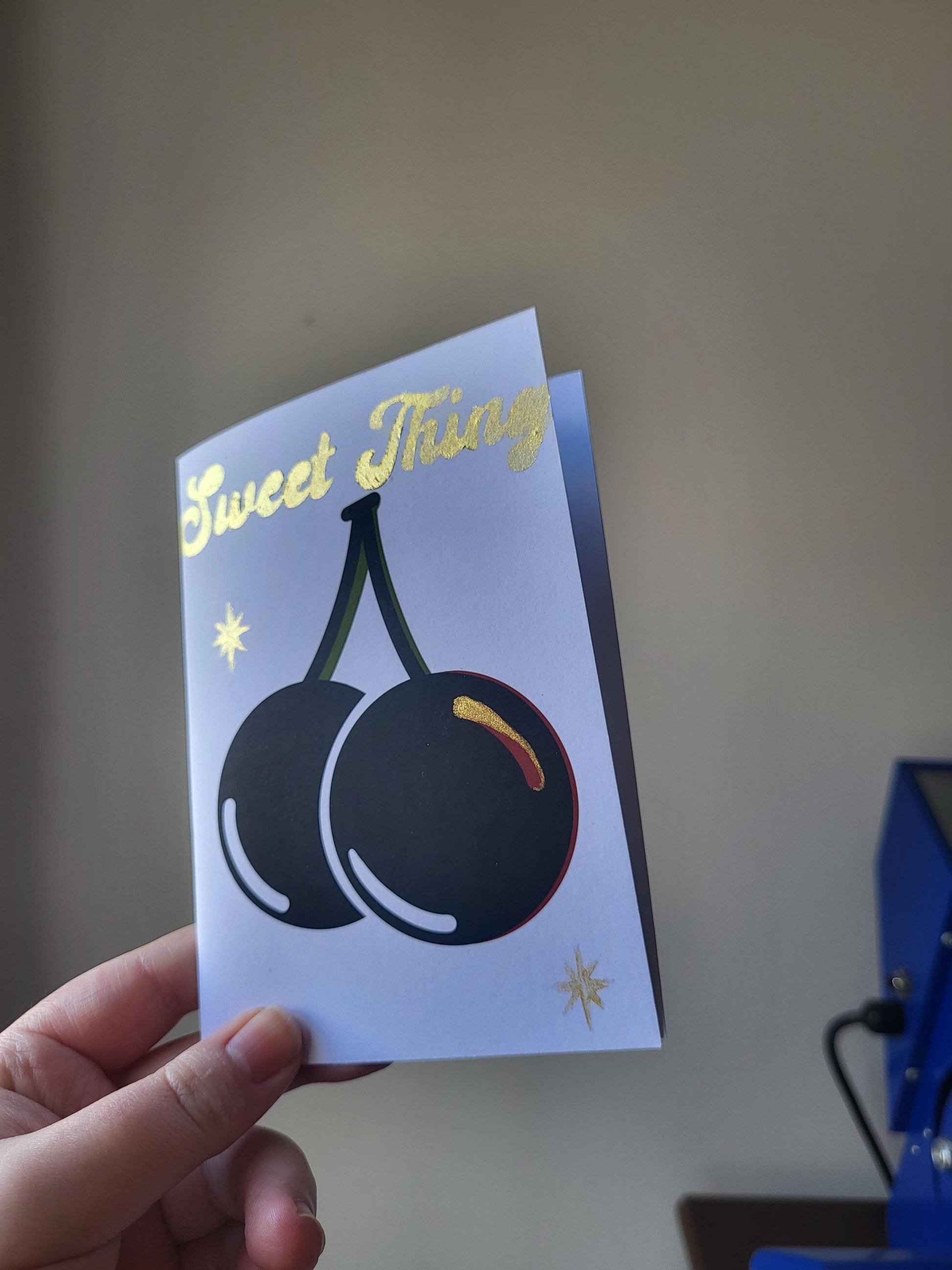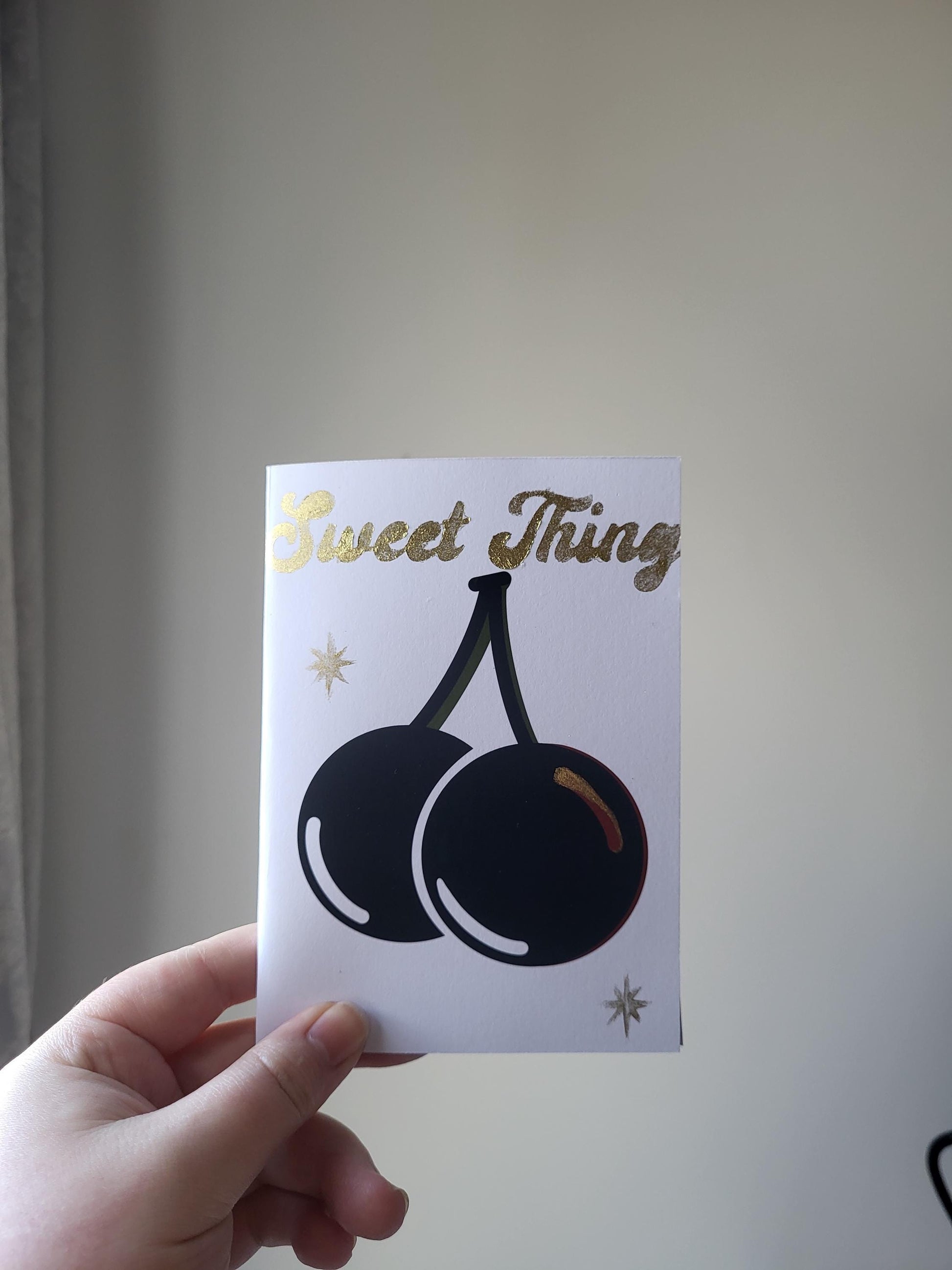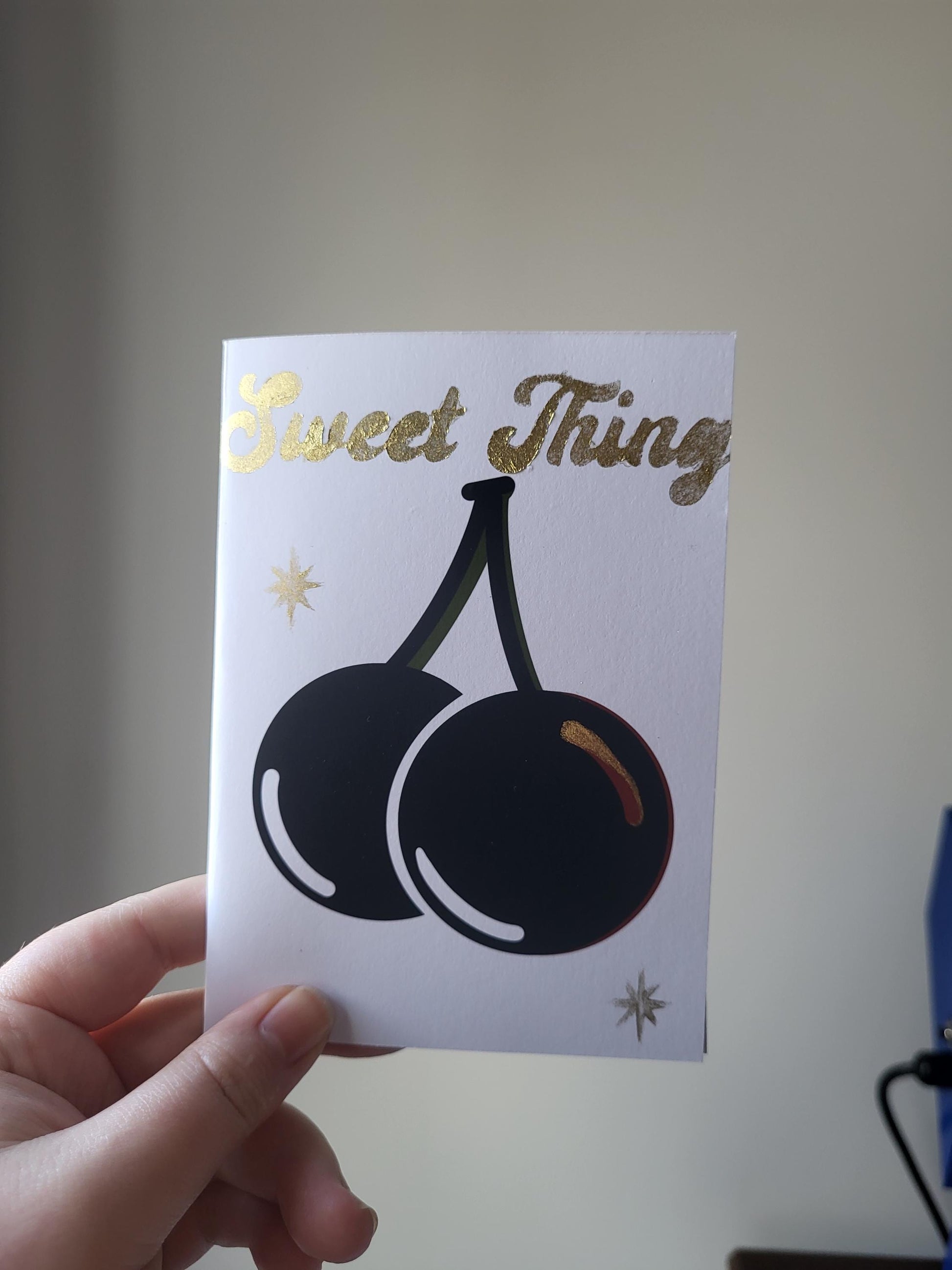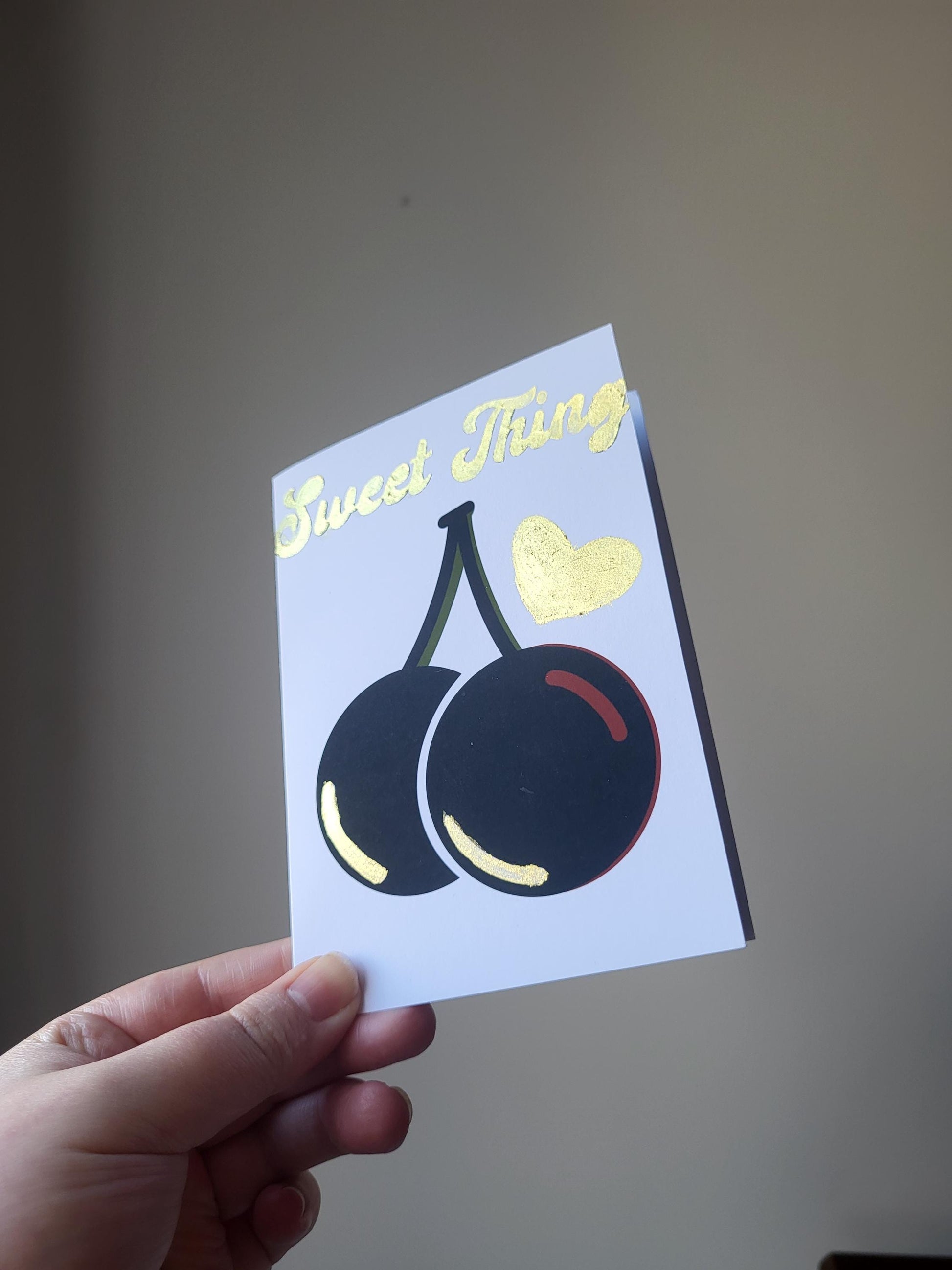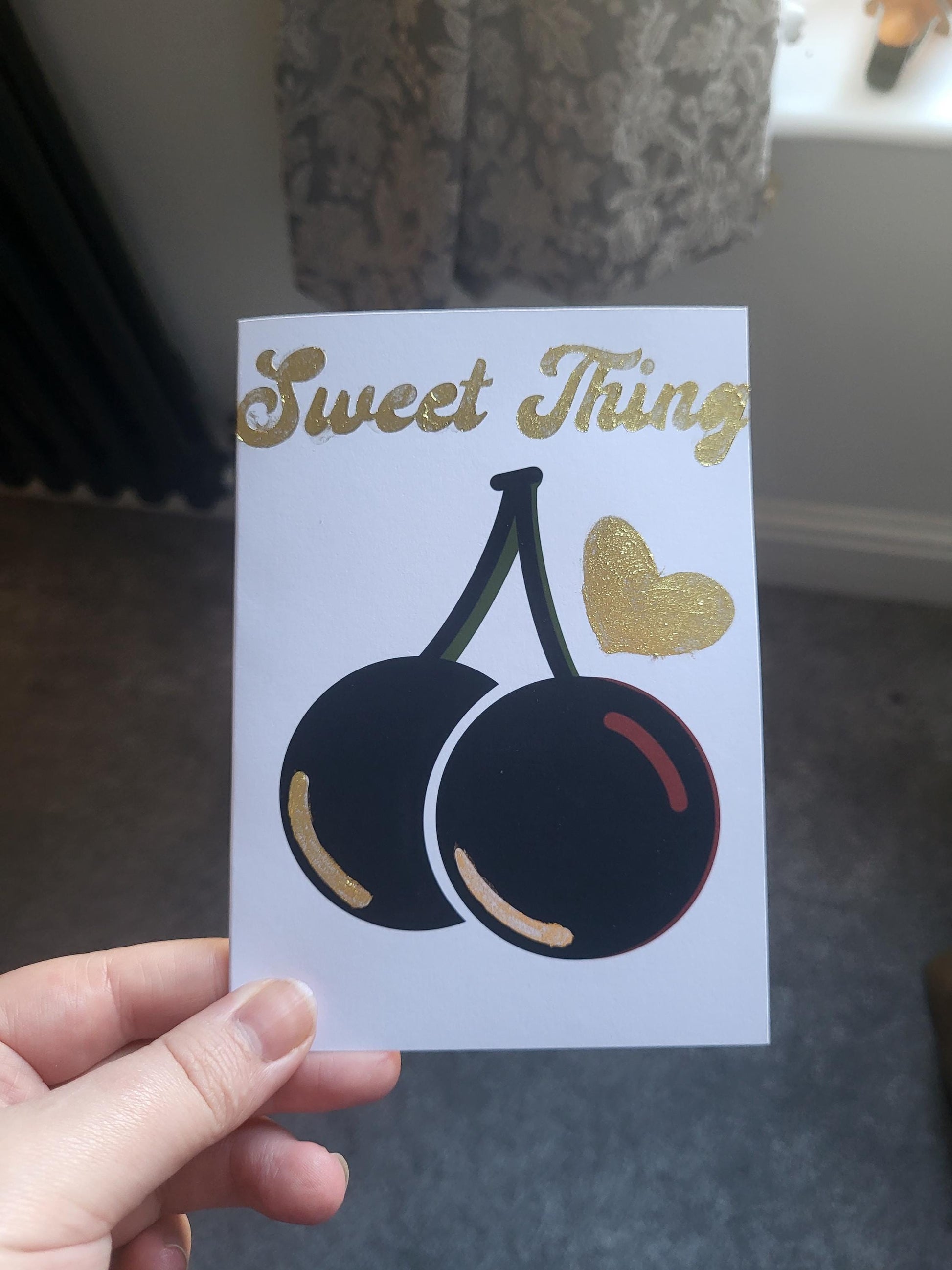 Small approx 14cmx7cm cherry sweet thing cards, with gold embellishments